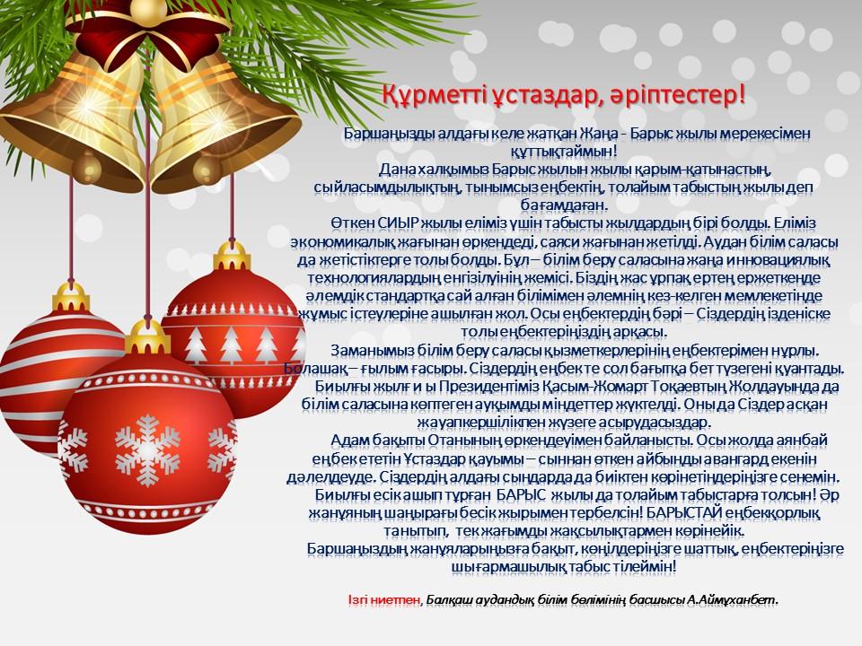 Құрметті ұстаздар, әріптестер! Баршаңызды алдағы келе жатқан Жаңа - Барыс жылы мерекесімен құттықтаймын! Дана халқымыз Барыс жылын жылы қарым-қатынастың, сыйласымдылықтың, тынымсыз еңбектің, толайым табыстың жылы деп бағамдаған.